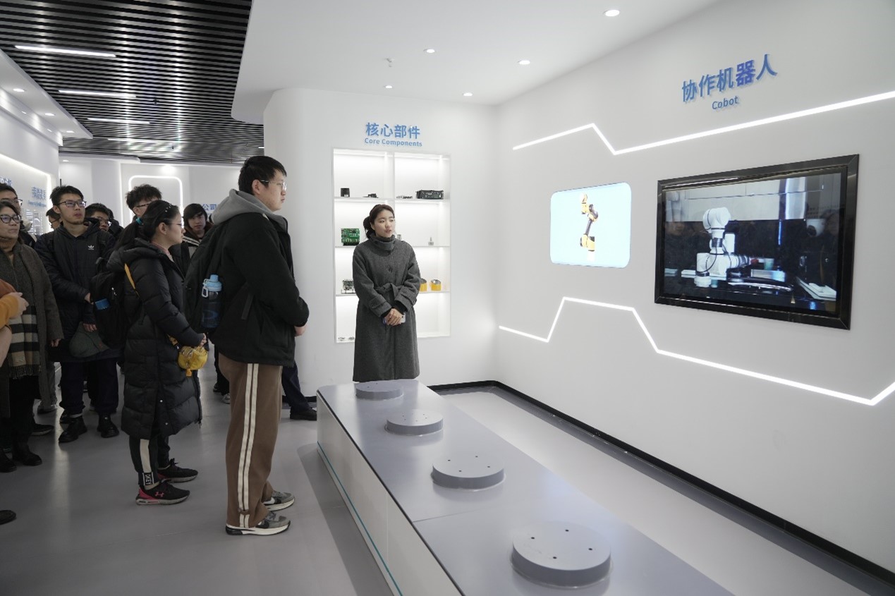 下午,在中国科大江苏校友会的陪同下,访学团队转场前往校友企业江苏集萃智能制造技术研究所有限公司。在基地参观过程中,师生们先后走进集萃智造生产调试车间、企业展厅等场所,近距离观摩了集萃智造在协作机器人、无人车等领域的核心技术成果。一系列聚焦实际应用场景的技术突破,让师生对集萃智造“技术突破 — 场景落地 — 生态构建”的发展路径建立了直观认知。