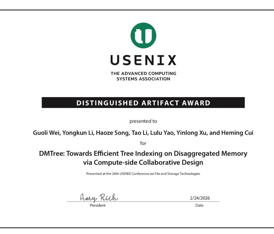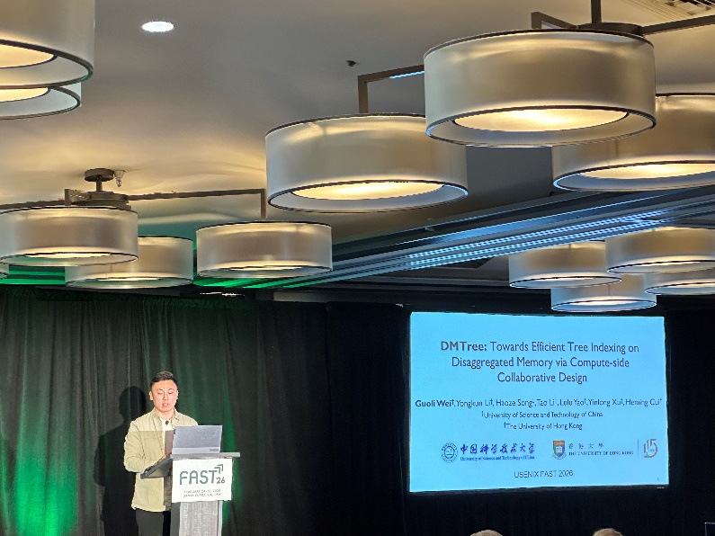 2月24日-26日存储系统领域最具代表的顶尖国际学术会议文件与存储技术大会FAST在美国加利福尼亚州召开,计算机科学与技术学院先进数据系统实验室研究团队的论文“DMTree: Towards Efficient Tree Indexing on Disaggregated Memory via Compute-side Collaborative Design”荣获2026年大会杰出研究成果奖(Distinguished Artifact Award),本次获奖是FAST举办24届以来我校首次斩获该殊荣。