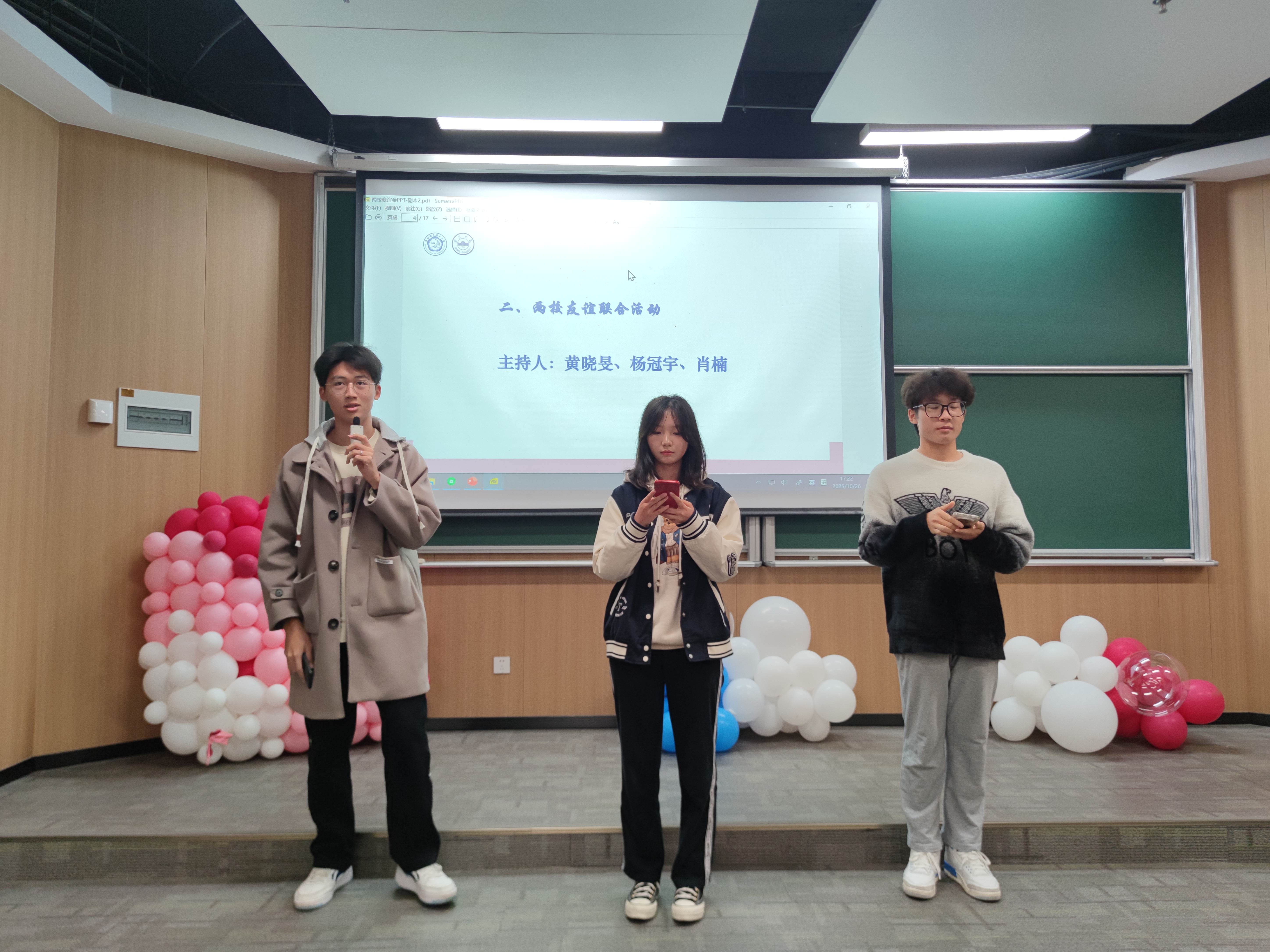 活动的第二环节为轻松愉快的互动交流,由两校学生黄晓旻、杨冠宇、肖楠共同主持。在首轮进行的“击鼓传花”游戏中,随着动感的音乐,接到“花”的同学纷纷进行个性十足的自我介绍,并参与了妙趣横生的数字竞猜与诗词“飞花令”,现场气氛迅速升温,同学们在欢声笑语中打破了初识的隔阂。